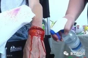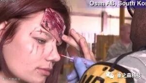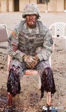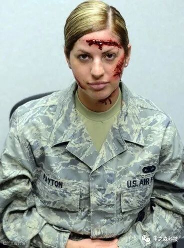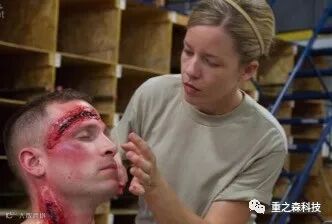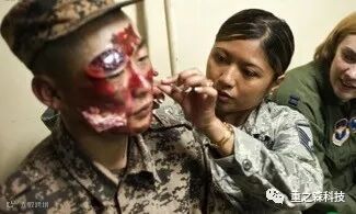 图为美军演习中制作的模拟被弹片割伤的士兵手腕。现在美军中已经有很多现役以及聘用社会专业MOULAGE技术人员,被称为印模艺术家(MOULAGE Artist),专门为美军的战场救护实战化训练服务,收到了非常好的效果。其实稍微看看美国的军事大片,就知道美国有大量这样的化妆及特效专业人才。