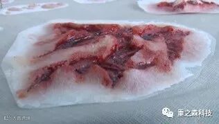 图为准备贴在真人上的软体战伤模型,模拟肌肉被撕裂的场景。