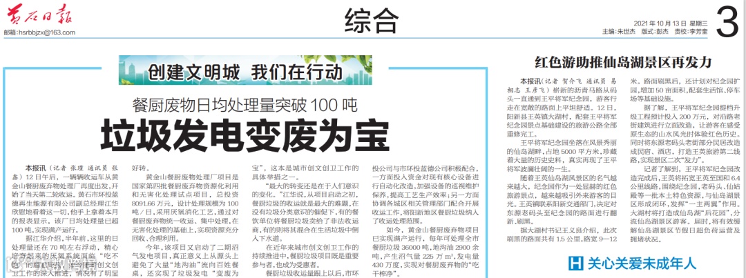 如今,黄金山餐厨废弃物项目已实现满产运行,每年可处理全市餐厨垃圾36000吨,地沟油2900余吨,产生沼气量225万m³,发电量430万度,实现对餐厨废弃物的“吃干榨净”。