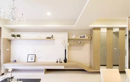 不规则的流线层板串联起电视墙和玄关区域