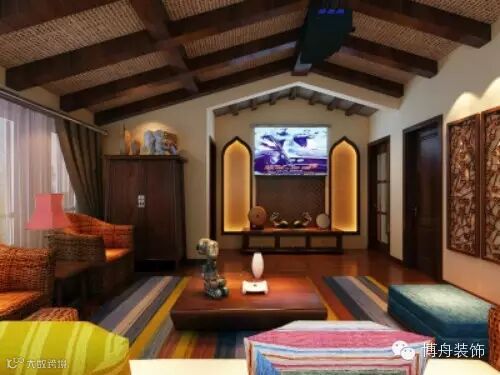 东南亚风格的设计也以藤竹柚木为材质,纯手工制作,朴实不失自然感。如这个阁楼客厅设计,整体木质感、纹理感十分强烈,颜色统一和谐;褐色系列的藤竹式的天花顶与木纹砖、衣柜、墙饰相呼应。另外,再融入色彩明亮的民族范条纹布艺沙发点缀,整体上明快简洁并暗藏禅机,充斥着无以比拟的自然美感。