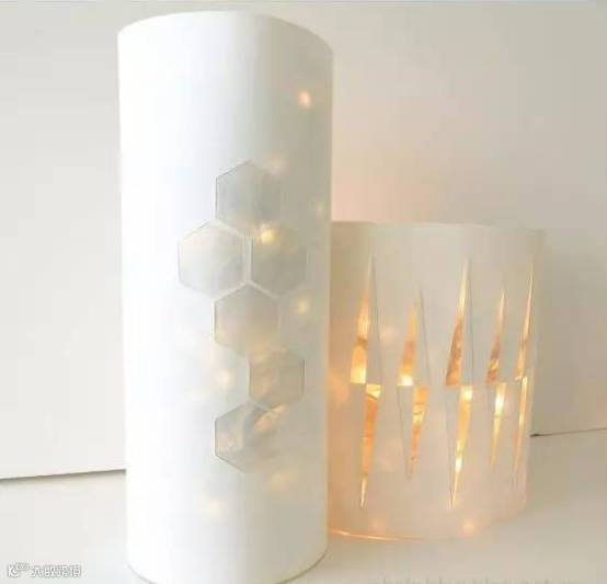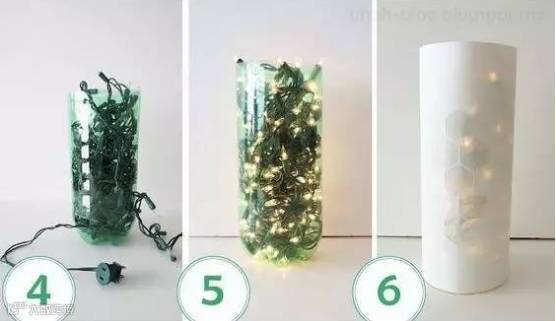 ▼将小灯泡放进塑料瓶里,插头从小孔里穿出来,外面套上一层白色的卡纸