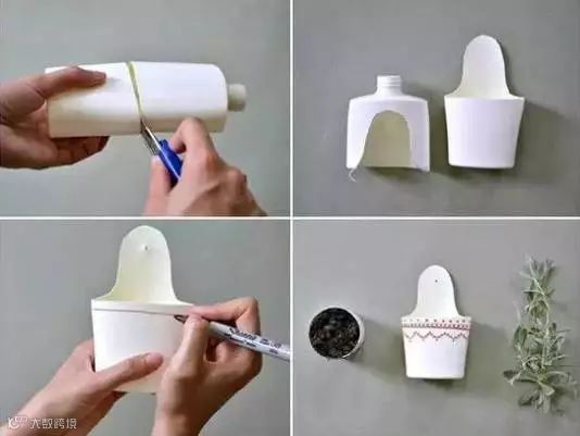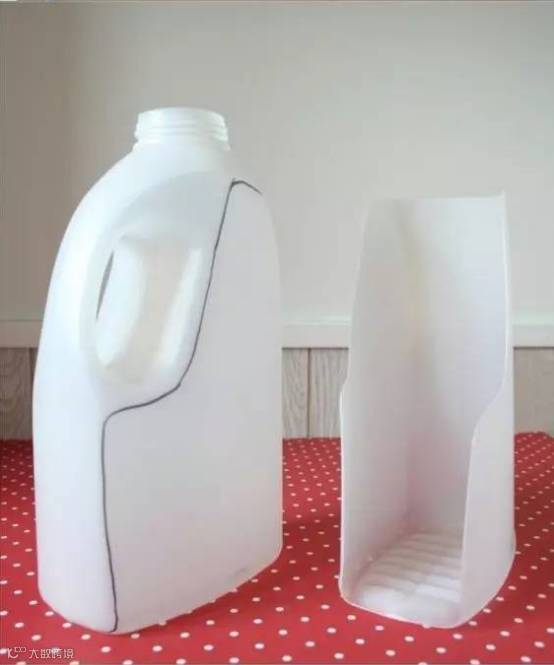 ▼大瓶矿泉水的瓶子可以做成很好的收纳盒哦~将塑料瓶从头部剪开,贴一层胶带防止划伤,再在两侧戳上小孔,穿上绳子,一个小提篮就完成啦~