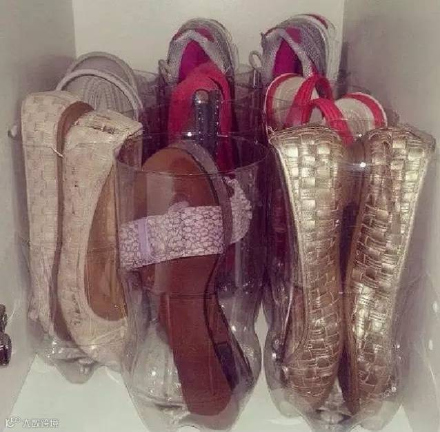 ▼鞋子太多怎么办?将大号塑料瓶剪开,就能装鞋子了~几个塑料瓶就将柜子的收纳能力提高了好几倍!