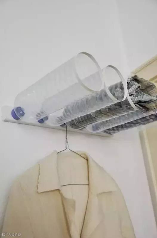 ▼大号塑料瓶固定在墙上,可以放一下小件衣物,方便好拿~