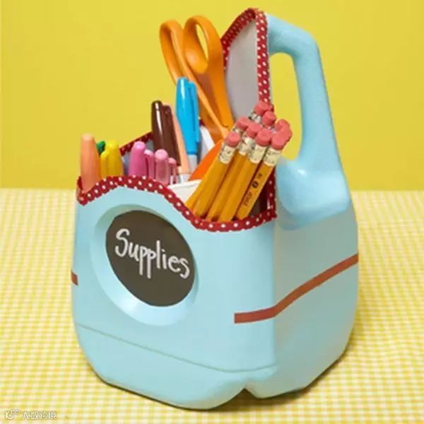 ▼将装牛奶的塑料瓶割开,涂上颜料稍作装饰,就变成了文具收纳盒~