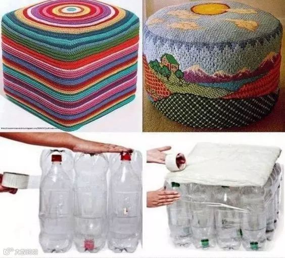 ▼塑料瓶还可以变成沙发!将若干个大小相同的大号塑料瓶头尾相间摆在一起,用胶带粘牢,再在一侧铺上泡沫或者软布,最后再套上一个沙发套就完成啦~
