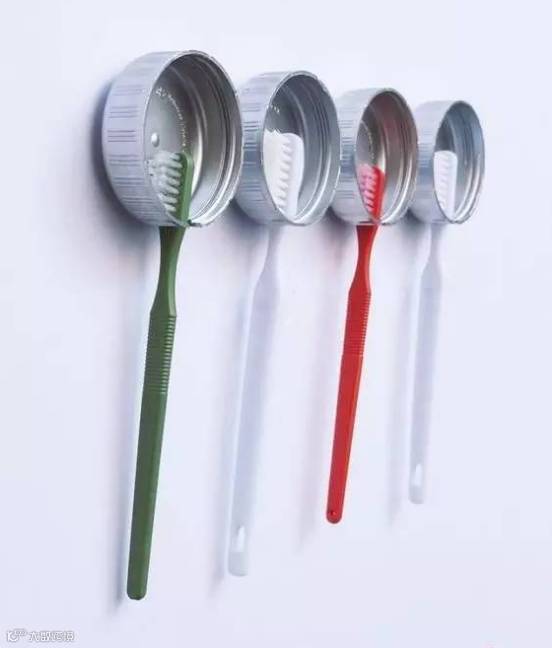 ▼把塑料瓶的盖子粘在墙上,也可以用来放牙刷~