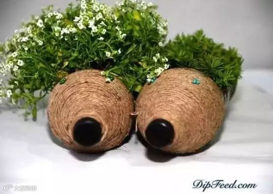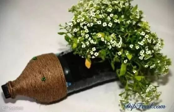 2.将大号的塑料瓶剪开,装上土壤和植物,为了让花盆更好看,可以在塑料瓶外缠绕一层麻线
