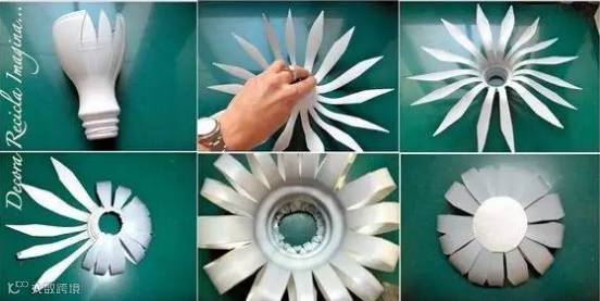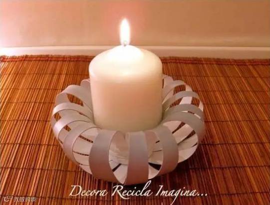 ▼剩下的瓶子上半部分还可以用来制作烛台哦~将塑料瓶按照如图的形状剪开,将剪好的塑料片向内翻折并固定住,一个美丽的小烛台就完成啦~