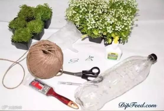 1.准备麻线、剪刀、胶水、刷子、塑料瓶