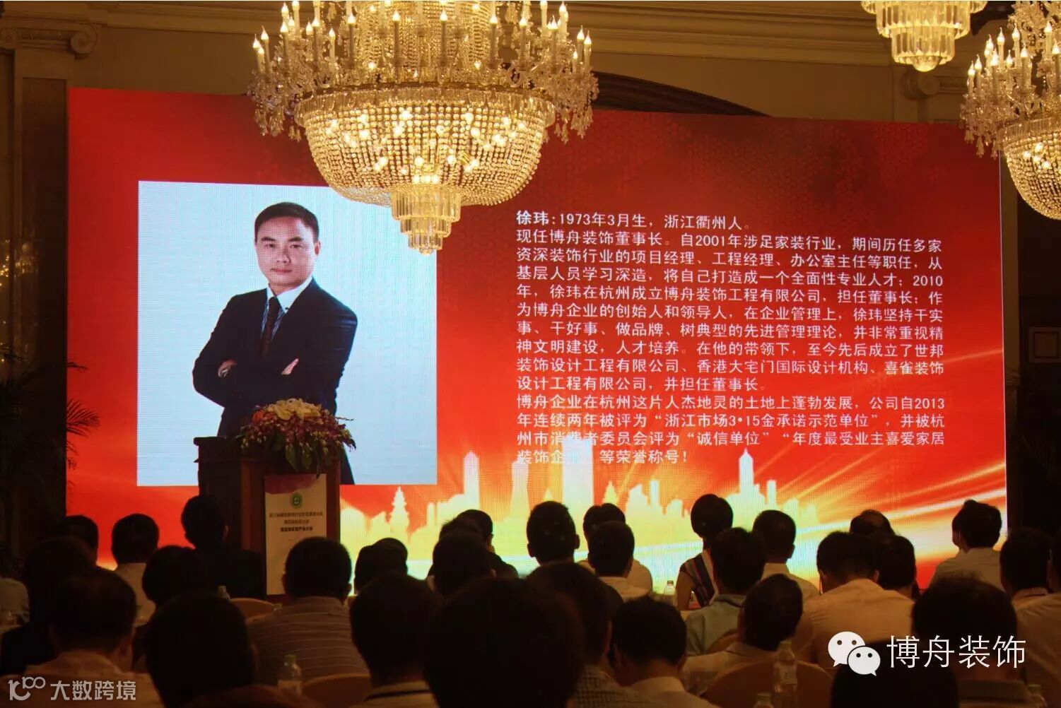 博舟集团再添一喜!本次大会表彰了博舟集团旗下的杭州博舟装饰工程有限公司为家装十大领军企业。博舟装饰由徐玮先生创立于2010年,作为最年轻的的“十大领军企业”,能在五年时间内脱颖而出,横扫整个浙江家装市场,与博舟装饰的企业文化、经营理念分不开,更与总裁徐玮先生的个人魅力分不开。