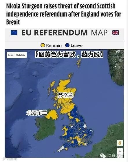 3.英国国内玩脱了。在投票前,苏格兰首席部长表示,就如果英国投票决定退出欧盟,那么她将举行一次新的公投来决定苏格兰是否退出英国——退出后,它将以独立国家的身份重新加入欧盟。从投票结果看,苏格兰和北爱尔兰在地图上黄得明显,黄的骄傲。英国脱欧以及后续的卡梅伦辞职事件将使英国面临解体风险。
