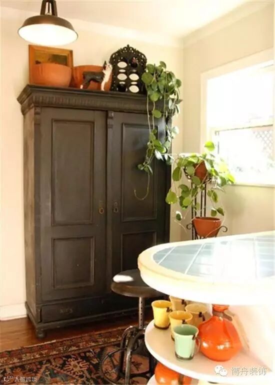 深色的橱柜搭配上垂悬累的活力植物,则一点不显得深沉笨重了,暖色的墙壁与采光一起营造了一个温馨的厨房空间。