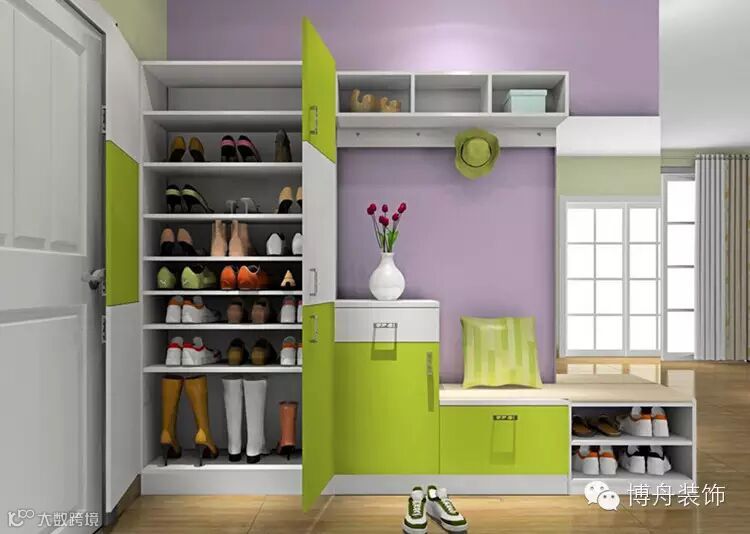 推开门,就是长长的玄关,直线条的空间让玄关打造中规中矩。白绿色调的鞋柜占据玄关大部分的墙面空间,让家里的鞋子都有一个安身之所。