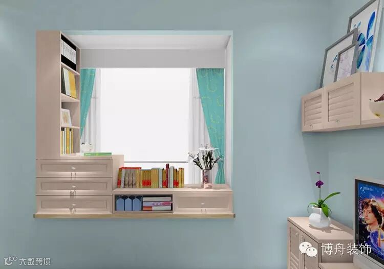 飘窗凹位处也可以设计成书柜的形式,适合无法腾出多余空间作为书房的小户型人群。