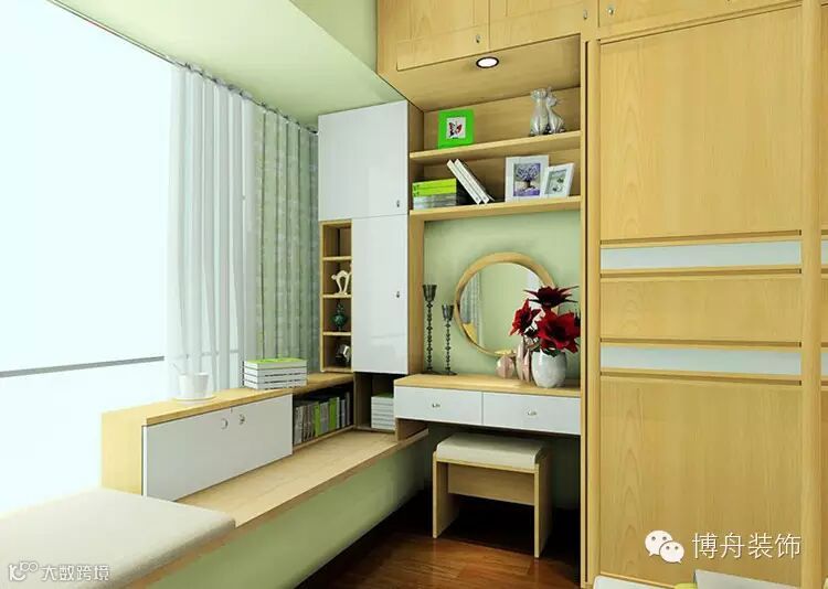 飘窗边是个凹形区域,根据空间实际情况,设计成衣柜与梳妆台的组合,搭上飘窗,功能十分强大。