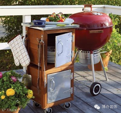 28.在暖和一点的天气里阳台上的烧烤架就成了一个活动中心,小编从<这个老房子>上看到这个点子,一个二轮货运马车上面配置的一个放置烹饪工具,装食物的大浅的收纳柜,上面盖着一个金属包裹的胶合板,这个家具是完全为烧烤量身定制的,这个漂亮的阳台家具只会花费你大约150美元左右,所以你就不用担心烧烤产生的杂乱环境,把注意力放在牛排上,让美味的牛排伴着你度过一段美好的时光。