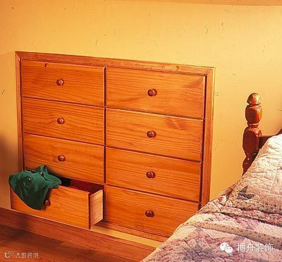 8.你可以把隐藏的没用的空间变成一个意想不到的储藏区域,这里,你可以把一个五斗柜隐藏在楼上卧室的承重墙里面。你会得到一个最大尺寸的八抽屉空间,而且并不会占用你室内地面空间。