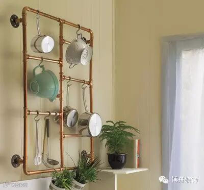 16.一个唤起维多利亚时代风格的方法就是将管道做在墙面上,用铜质的架子做出将水管暴露出来的效果。你可以用家用管道零件在几个小时在组装起这个餐具挂架,加入高尔夫发球台和一些家用五金代替了需要焊接的这一操作步骤,黄铜抛光让这个架子看起来更加闪亮就像一枚新便士。
