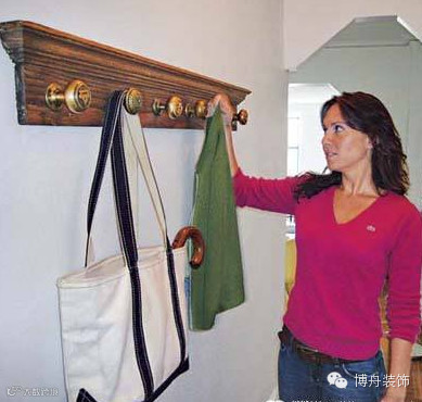 23.在忙碌的一天过后还要收拾在壁橱里面乱七八糟的衣服是一件很糟心的事情,你可以在前门入口附近的墙壁上做一个简单的衣帽架来解决这个问题,这个挂钩式由六个漂亮的玫瑰花饰的门把手和他们在房子装修的时候剩下的一条宽的装饰线条做成的。