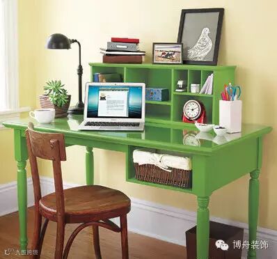 9.如果你缺乏一个专门付账单,和收纳松散的杂物的地方。一张好的书桌是必须的。这张书桌是用胶合板加上丙烯酸薄膜做的柜体,而且并没有设计柜门,抽屉里面放置的是竹编框可以更好地收纳,柜门的材料被做成了桌面上的杂物格,增加了桌子的使用效率,虽然没有担保,但是这张桌子看起来在邀请你来这里工作多一会的样子。
