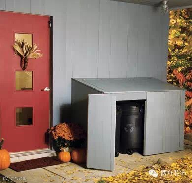 用一个周末的时间来做一个足够大的垃圾堆放间,至少可以防止两个32加仑的垃圾桶和几个垃圾箱,上面弹簧门让扔垃圾变得更加简单,前面是两扇门,让笨重的装满垃圾的垃圾桶容易搬出来,而且这个垃圾桶外表伪装的跟屋子一样,看起来非常帅气。