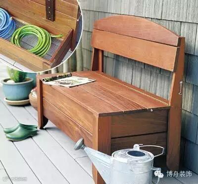 7.一条室外的长凳是一个非常合适的地方来放你沾满泥巴的靴子,当然,如果能放下一条或者两条花园水管,和一些其他的杂物会让你的花园看起来更加的整洁。你可以用抗风化的雪松来做一把这样子的长凳,并涂上油漆让他看起来个更加的漂亮。