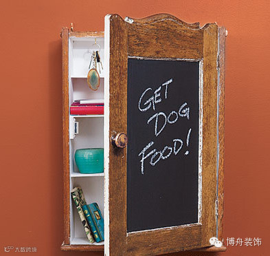 24.谁不厌倦杂乱的工作台面.家里的钥匙,账单,和家人的日常安排。这里,一个药柜让这些都变得井井有条,药柜的前面用黑板涂料刷了一遍,后面是用软木做的,一排钩完美的解决了钥匙的杂乱问题。