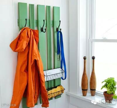 14.堆积在门厅的大衣和夹克从来不是一个让人喜欢的场景,找到一个地方来放置这些东西是一个巨大的挑战。受到小别墅的启发,为什么不在墙面上修建一个只有几英尺的墙面收纳空间,双衣钩和铁丝篮子,最大化的利用这个储存空间。木板下面的垫条保护了墙面不被刮花。