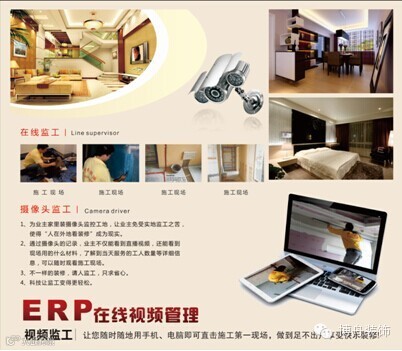 2010年公司率先引进的“ERP”在线监工系统。实现了在线视频监工,为客户省去了来回跑工地的时间;为公司省去了材料管控的烦恼;为项目经理省去了申报材料的时间;实现快乐装修新理念。