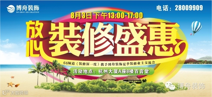 8月3日,博舟装饰携手66频道《装修深一度》栏目共同打造一场放心装修盛惠,为每一个有装修需求的业主带去放心和省心。本次活动是博舟装饰继3.15“装修不合格,砸掉免费重装”大型活动后与66频道的又一次携手,再一次碰撞,将会呈现给业主朋友们不一样的火花,敬请期待!