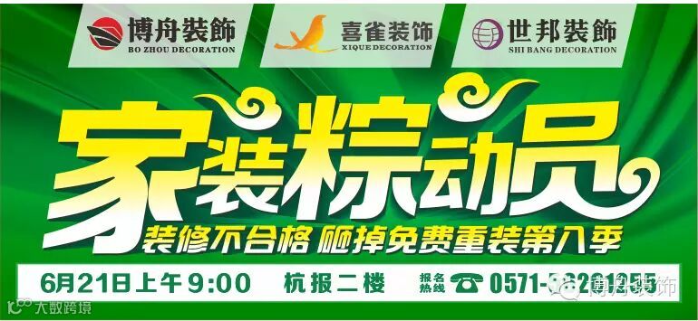 6月21日,杭城装修领航企业博舟装饰再度携手世邦装饰、喜雀装饰等多家装修公司,再次回馈广大业主,带来“装修不合格,砸掉免费重装”第八季!这个年中,强势来袭,惊喜不断!这个端午节,一起来杭报二楼,加入家装“粽”动员!