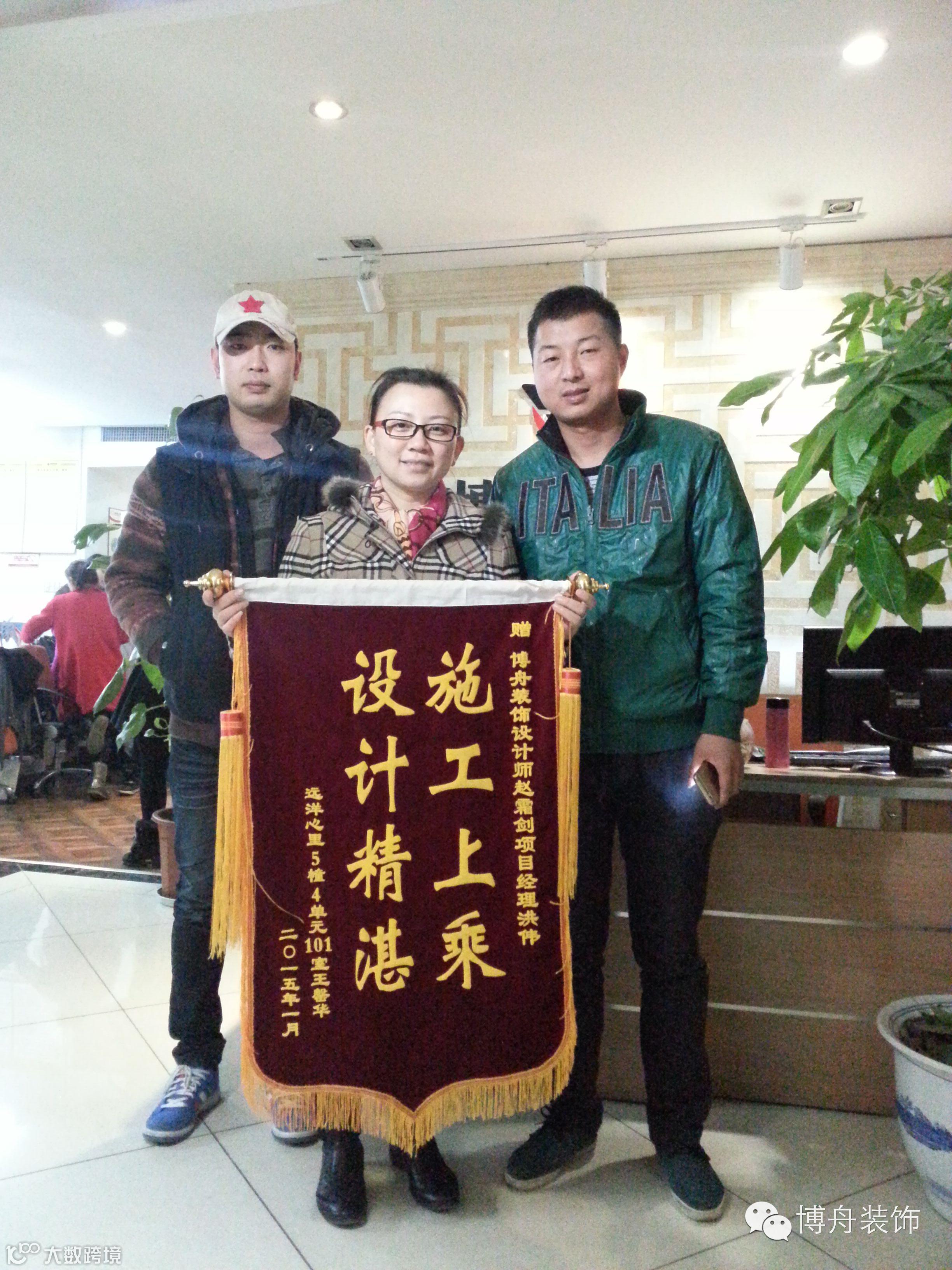 虽然客户送锦旗到博舟办公室已经成为一道日常的风景线,但博舟的员工依然兴奋、端重地接过每一面锦旗,这不仅仅代表着客户对博舟的信任,更是博舟员工引以为傲的荣誉!当设计师赵霜剑、项目经理洪伟接过客户王罄华送来这面绣有“施工上乘、设计精湛”的锦旗时,感觉所有努力的付出都是值得的!