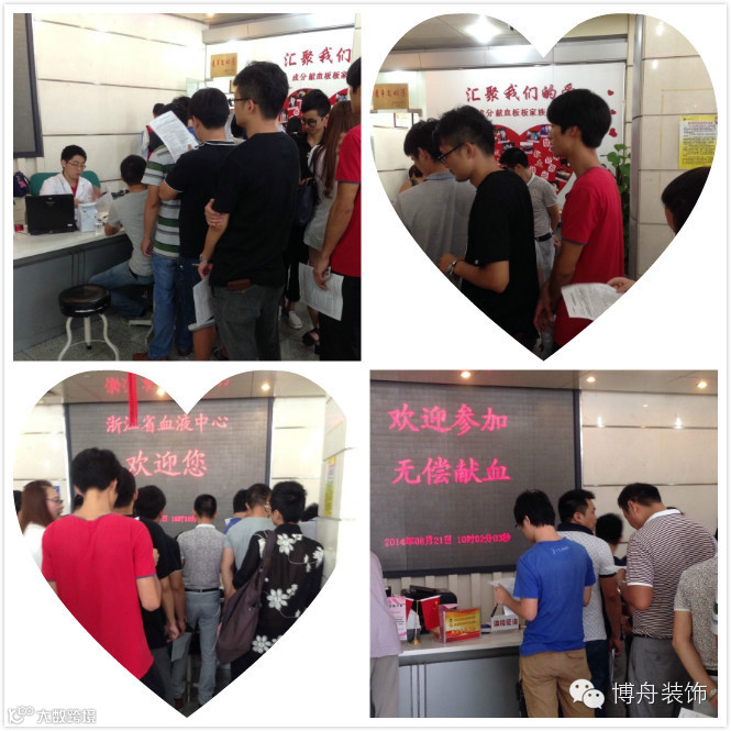 杭城结束了近日来的大雨天气,今天迎来了充满阳光的大晴天。在这一天我们感受到了来自博舟大家庭的温暖和爱。8月21日,在第一时间我们得知了博舟装饰一位设计师马西亚的妻子产后大出血的消息,需要大量血液,情况十分紧急。一件事,一群人,一辈子,不抛弃,不放弃,不离不弃,博舟精神在此刻得到了体现。为了一位母亲的微笑,也为了孩子的明天,博舟全体家人在徐总的动员下纷纷赶到浙江省血液中心献出自己的一份爱心。