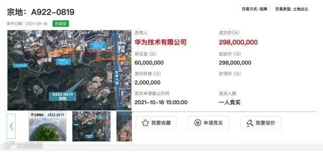 根据深圳公共资源交易中心网站显示,10月18日下午,华为技术有限公司以底价2.98亿拿下深圳龙华一宗“巨无霸”产业用地。