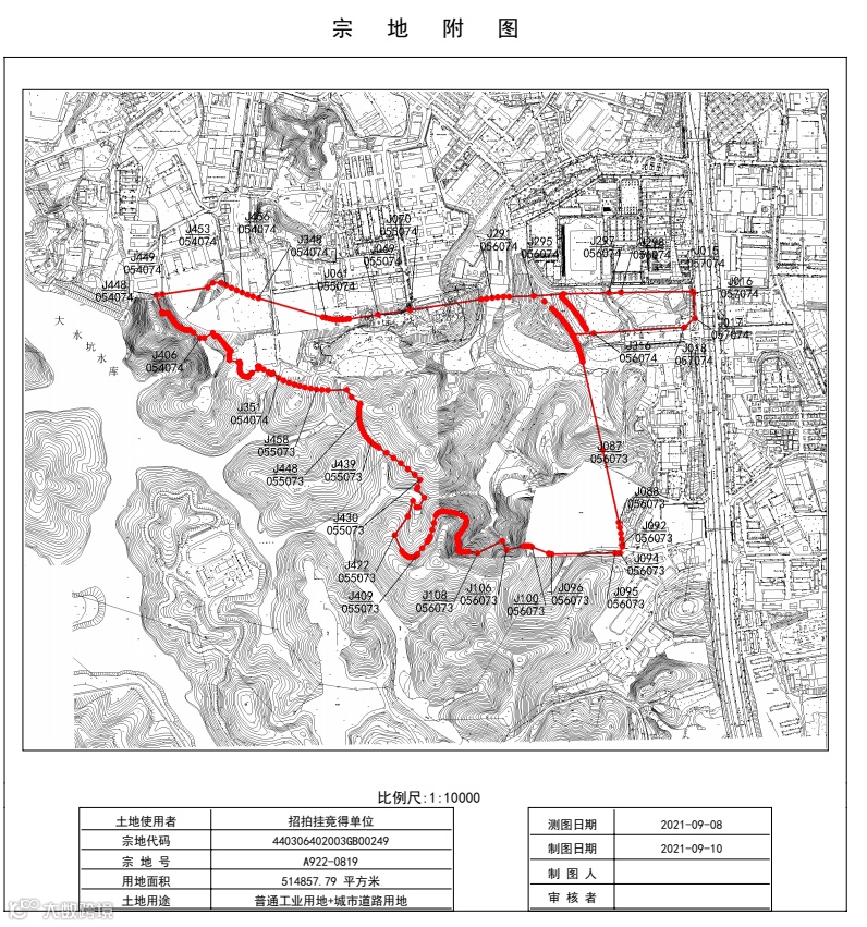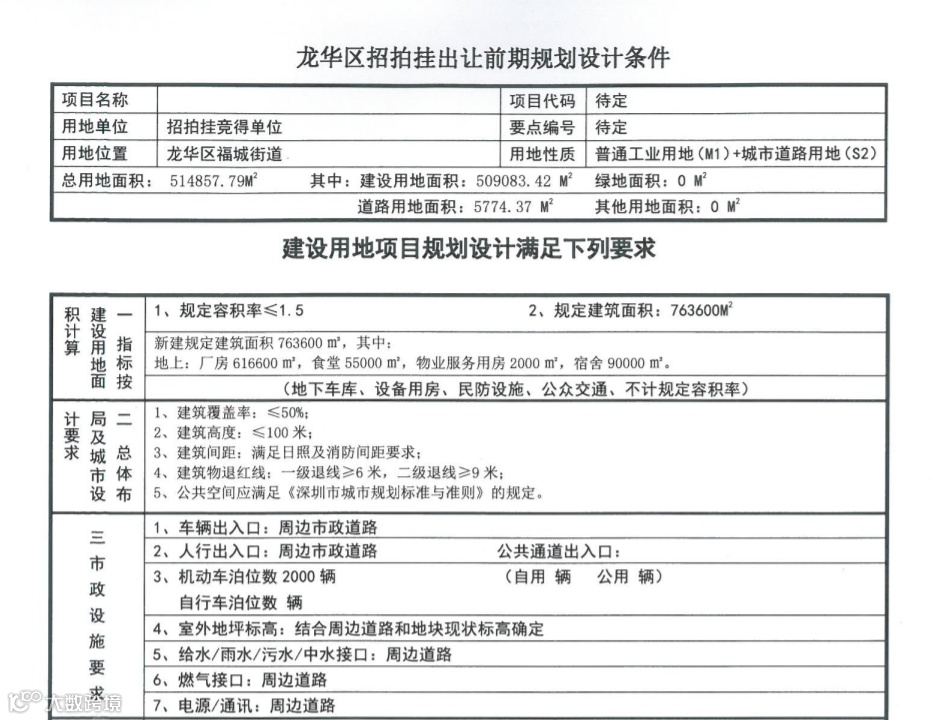 该宗地位于观澜富润路和龙澜大道交汇处,土地用途为普通工业用地+城市道路用地,建筑面积763600平方米,准入行业内别为A06新一代信息技术产业、A02新能源产业。