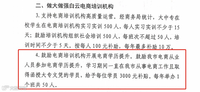 根据《(东商务〔2023〕18号)东阳市商务局 东阳市财政局关于加强白云街道电商产业集聚发展专项扶持政策》第二条政策内容,鼓励电商培训机构开展电商学历提升。鼓励我市电商从业人员参加电商学历提升,学习期间一直在我市从事电商工作且取得函授大专文凭的学员,给予每位学员 3000 元补贴。每年举办 1个班共 50 人。