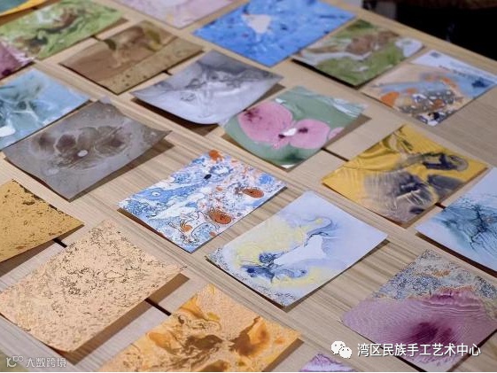 漆艺是中国传统的制造工艺技术,被广泛运用于生活用具上,在我国少数民族聚居地区有许多独具特色的漆器,如有名的彝族漆器。漂流漆又称漂漆,是将色漆倒入水中,色漆会飘在水面上,民众可根据各种手法使色漆呈现不同的晕染效果,再将准备好的折纸放在水面上,色漆会附着在折纸上,形成一朵飘漆折纸花。