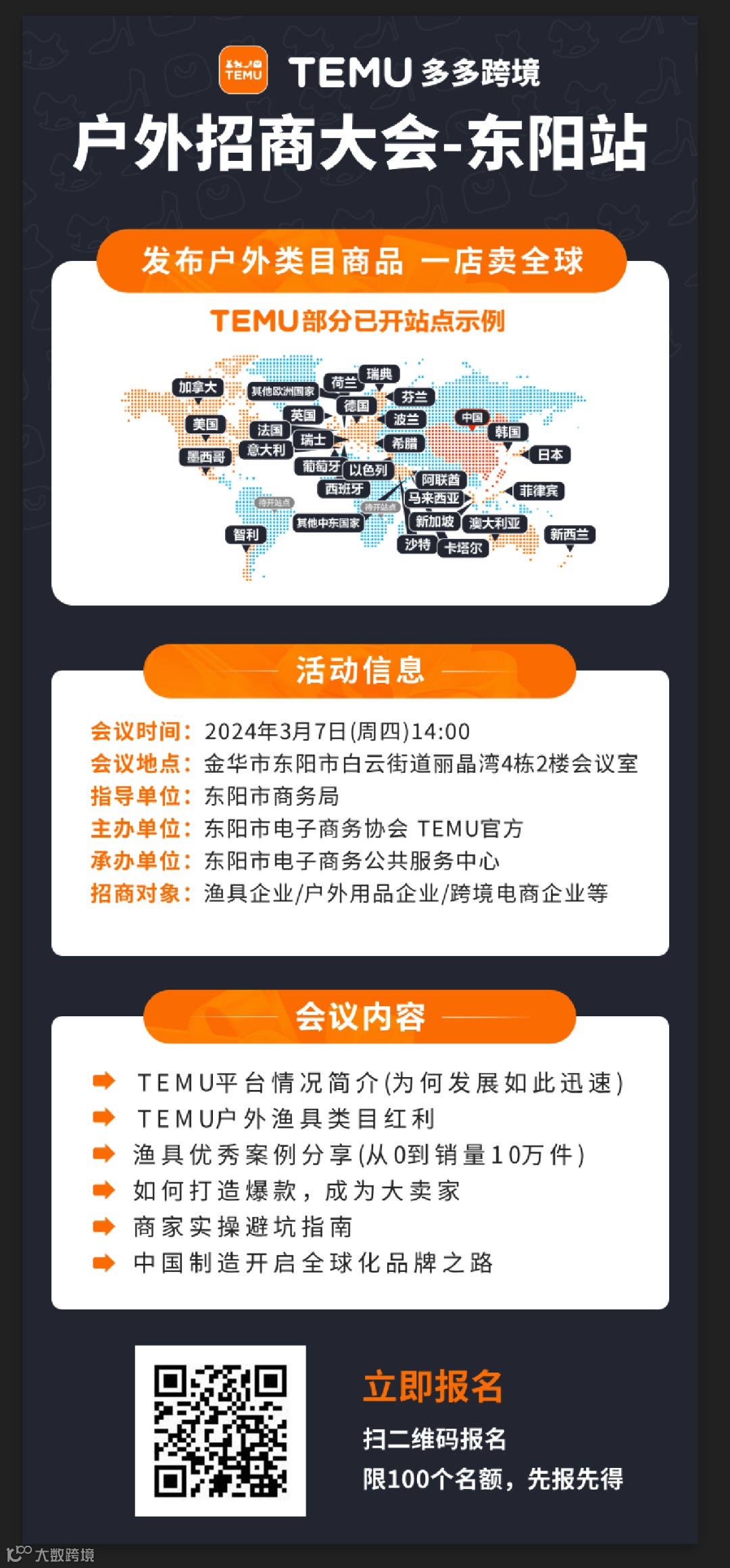 2024年3月7日,TEMU多多跨境户外招商大会东阳站启动。这是一场专为东阳本地渔具企业、户外用品企业和跨境电商企业量身定制的招商盛会,为您带来前所未有的机遇。诚邀东阳企业莅临。