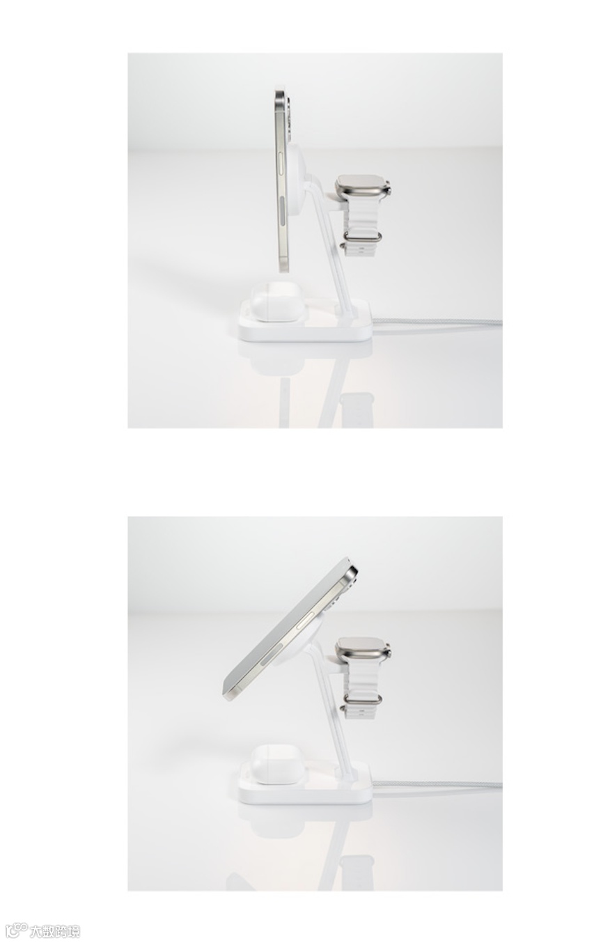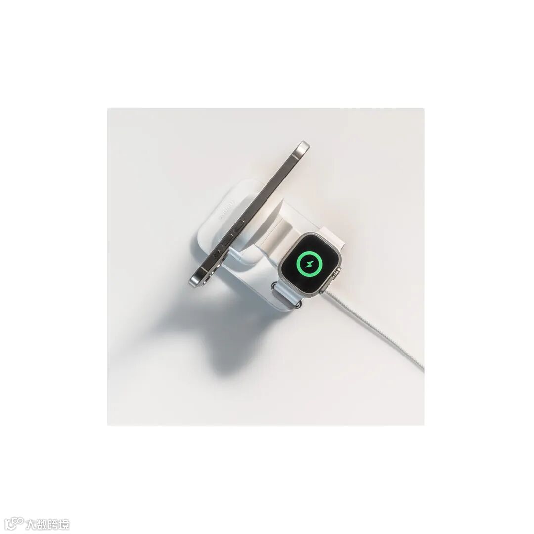 它可以同时为手机、Apple Watch 和 AirPods 充电,一台设备解决三种需求。早上起床,手机、手表、耳机都元气满满。而且它的设计非常合理,手机以合适的角度立在支架上,充电的同时还能随时查看消息、刷剧,解放双手。