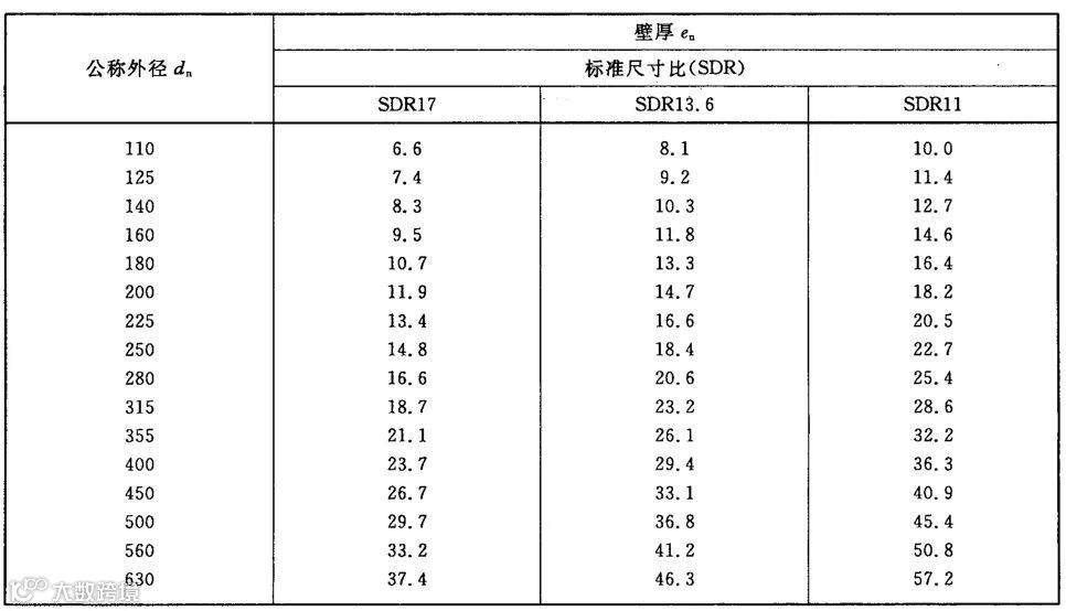 示例:若管道外径为110mm,SDR11的壁厚为 t=D/SDR=110/11=10 mmt=D/SDR=110/11=10mm。