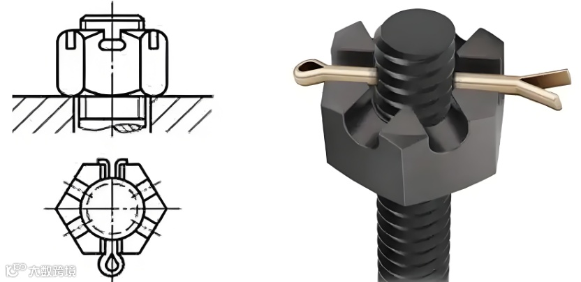 8、开槽螺母:与螺杆带孔螺栓和开口销配合使用,以防止螺栓与螺母相对转动。螺母拧紧后,把开口销插入螺母槽与螺栓尾部孔内,并将开口销尾部扳开,防止螺母与螺栓的相对转动。