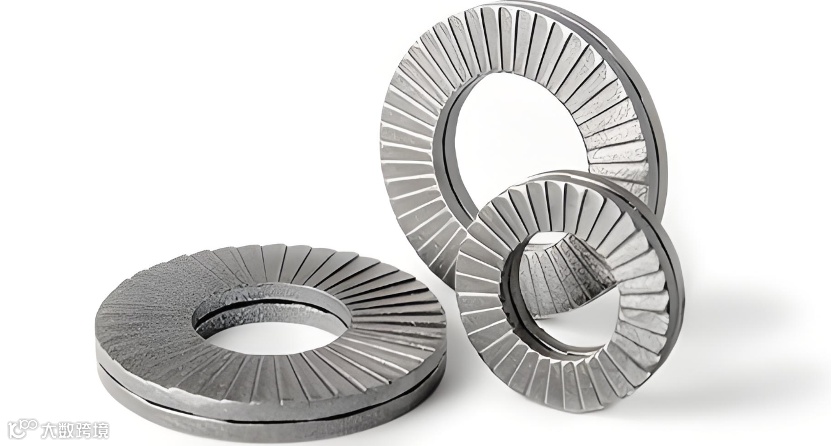 6、双层自锁垫圈:由两个圆形垫圈组成,内层和外层垫圈之间通过一系列凸缘和凹槽相互锁定。内层垫圈的凸缘与螺栓紧密接触,提供摩擦力以防止螺栓松动。外层垫圈的凹槽与内层垫圈的凸缘相匹配,使两个垫圈之间形成一个自锁的结构,进一步增加防松能力。