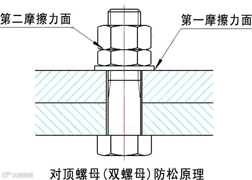 1、双螺母对顶防松:通过在螺栓上安装两个对顶的螺母,使它们之间产生相互作用的压力,形成阻碍螺母松动的摩擦力。当两个对顶的螺母拧紧后,它们之间的压力始终存在,任何一个螺母要转动都需要克服旋合螺纹之间的摩擦力,从而有效地防止螺母松动。