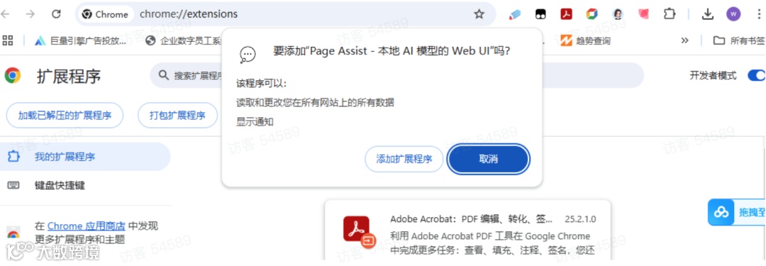 最简单的方式,浏览器插件Page Assist ,打开chrome浏览器点击上面三个点,扩展程序,管理扩展程序,打开开发者模式,把我们资料包的浏览器插件拖进去,添加,点击右上角管理扩展,将扩展程序固定在窗口栏即可使用。