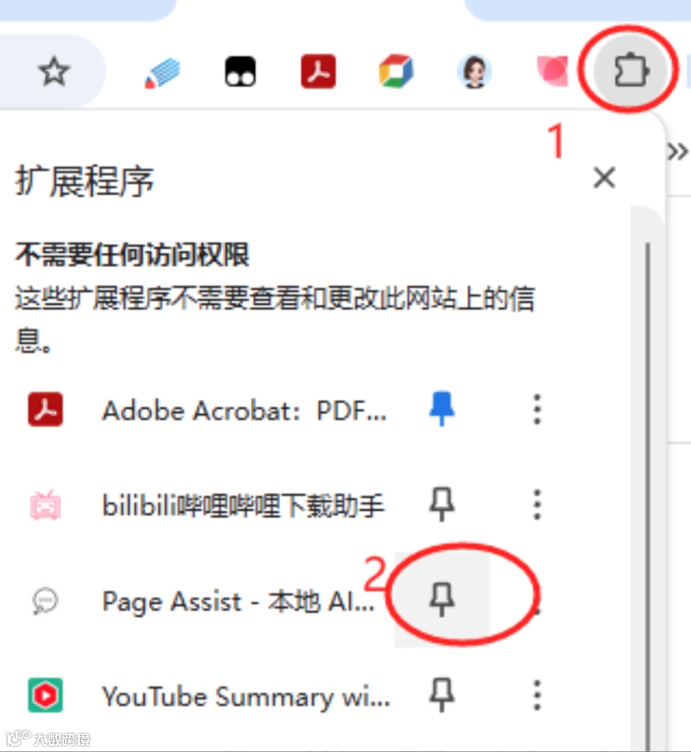 step3:点击浏览器右上角扩展程序图标,再点击固定按钮,就可以把这个插件固定在浏览器栏了
