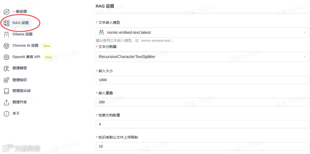 设置嵌入模型,用来向量化你上传的文档的,嵌入模型下载需要在命令提示符输入下面命令即可下载: