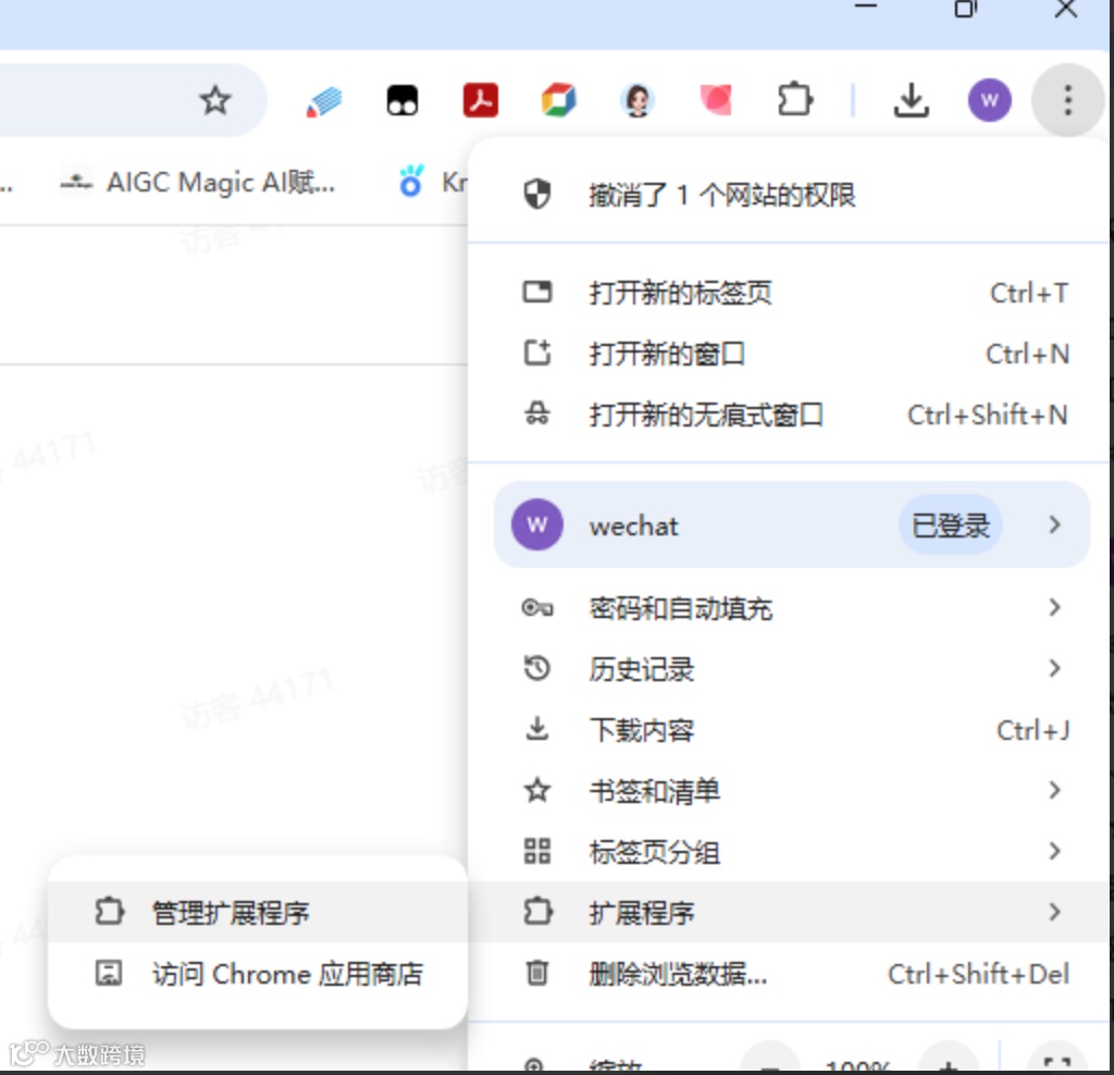 step1:点击chrome浏览器右上角三个点,管理扩展程序