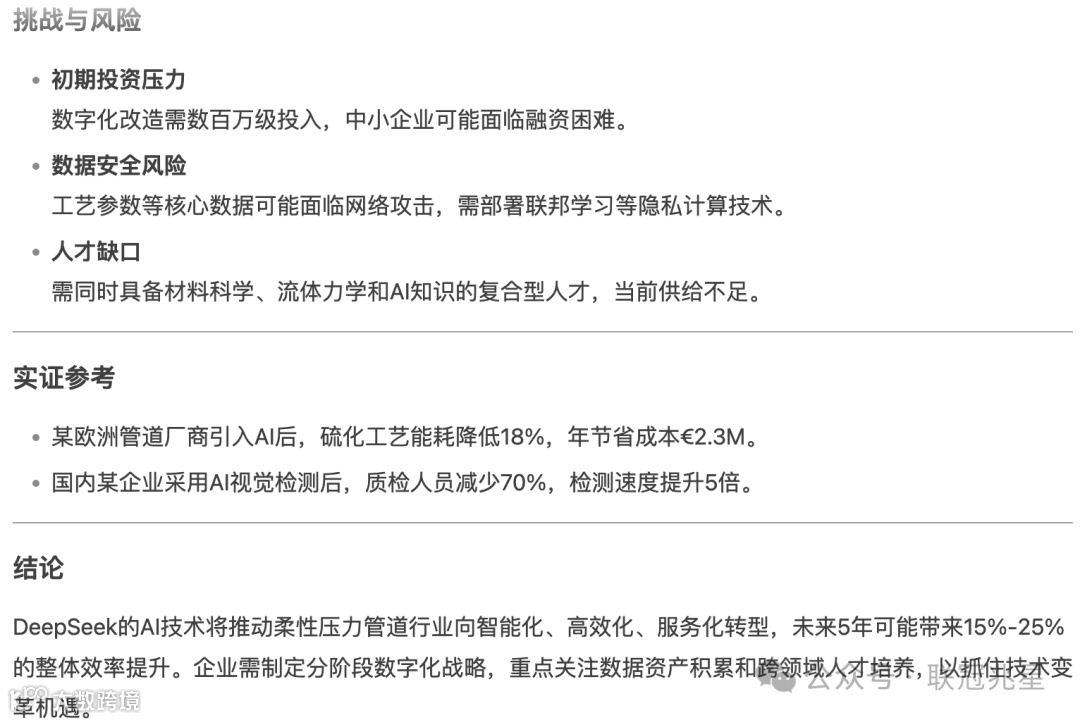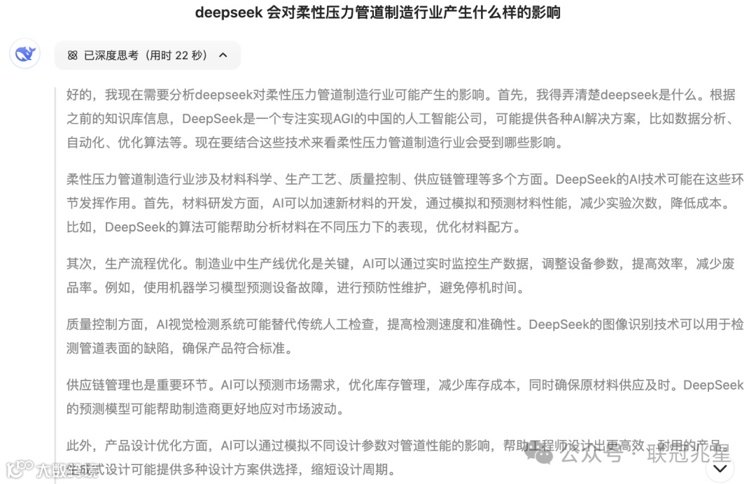 今天问了DeepSeek,它会对柔性压力管道制造行业产生什么样的影响,下面我们来看看它的回答,着实让人感到Ai的强大。